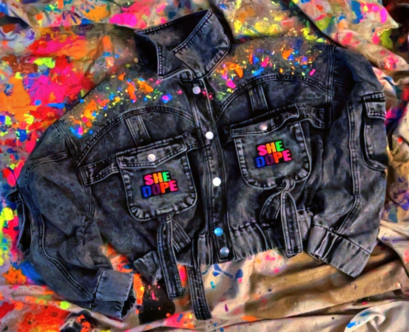 No one is you sis, that is your super power. This utility jacket is available in washed blue denim. Multicolored letters patches on front pockets, painted splattered shoulders, and colored details. This cropped jacket is definitely a show stopper. This jacket is Non stretch, front pockets, elastic hem, front Buttons, front straps, and runs true to size. 71% cotton and 29% polyester.