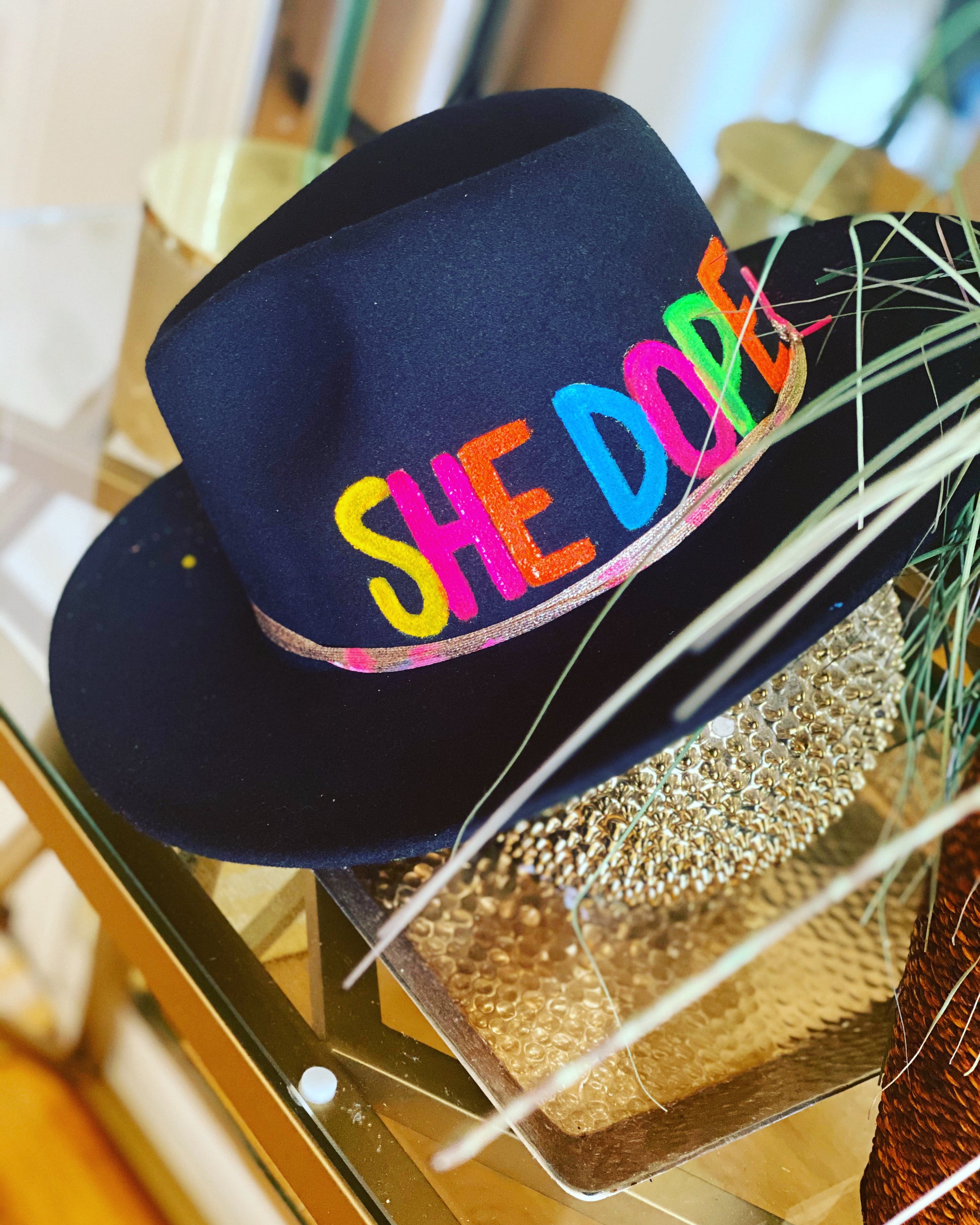 Rock this custom painted "SHE DOPE" fedora any day for all seasons. Production of this custom product takes up to 2 weeks. Fedoras is one size fits most measuring 57-59 centimeter circumference with adjustable string in the inside. Brim width is 3 inches. Made of Quality felt material. No Returns or exchanges. Hand wash only.