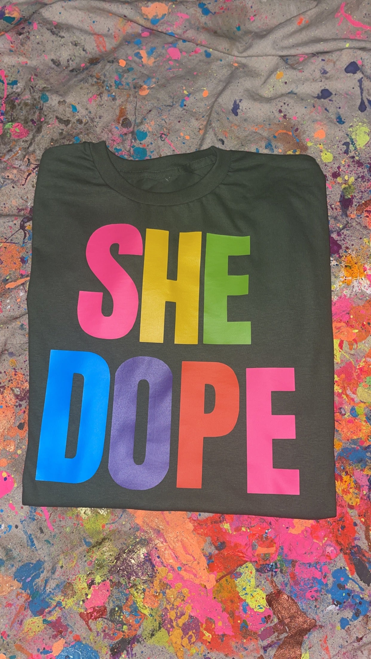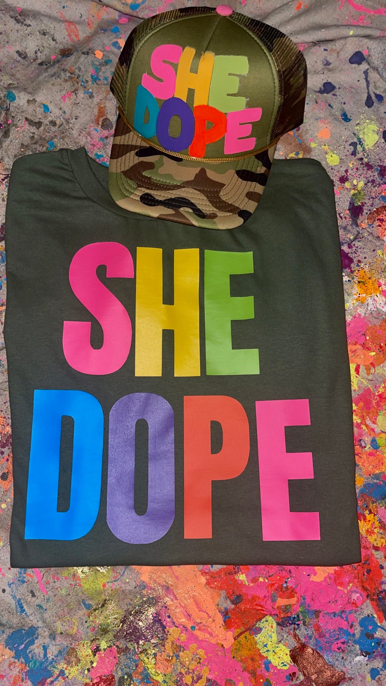 The tee is army green with multicolored letters. Made of 100% soft cotton. This is a standard tee. You can dress this tee up with our heavy weight camo cap up or dress it down. It’s just that classy. This cap is hand painted with multicolored letters.