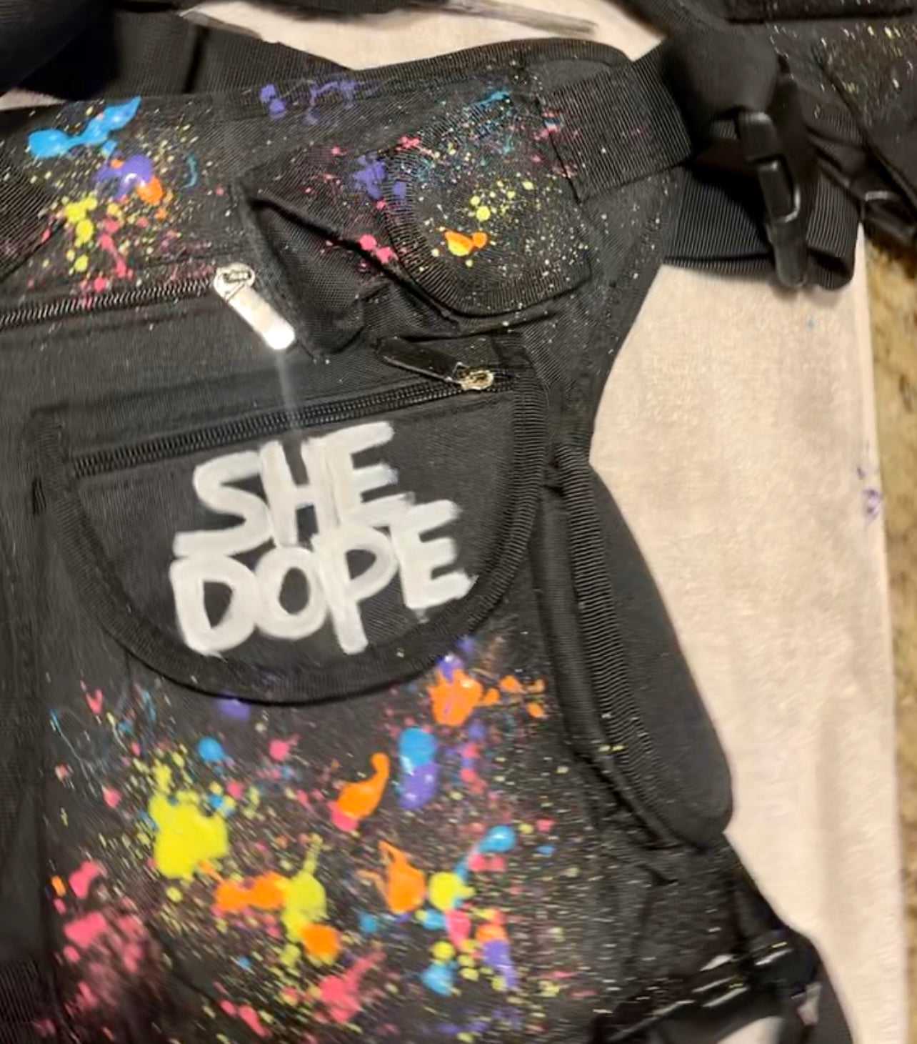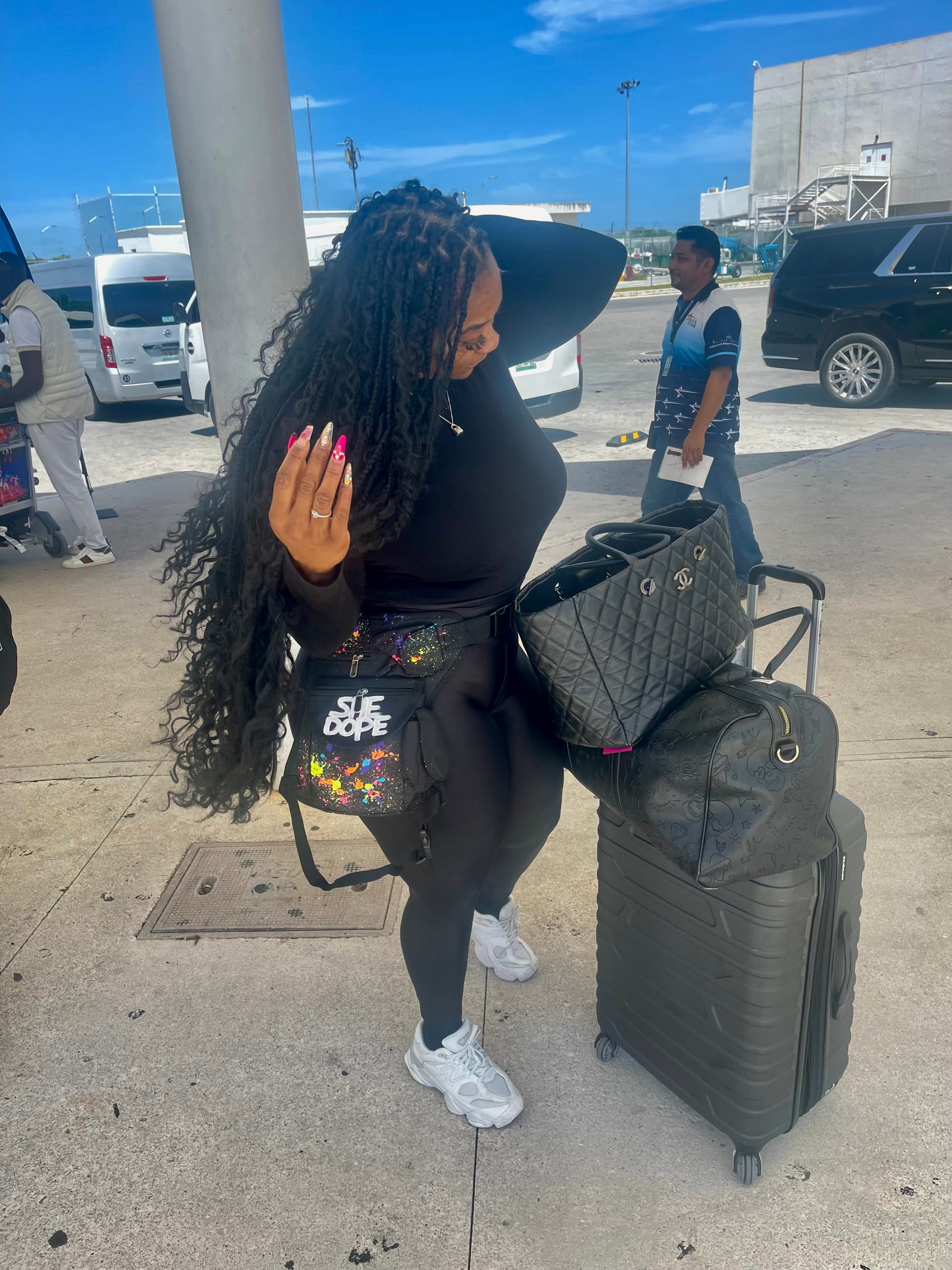 Custom hand-painted Black waist and leg bag with adjustable strap up to size 1x. No need to carry a handbag. The convenient way to still be fly. No Returns o this item. Exchanges are welcome for unworn product.