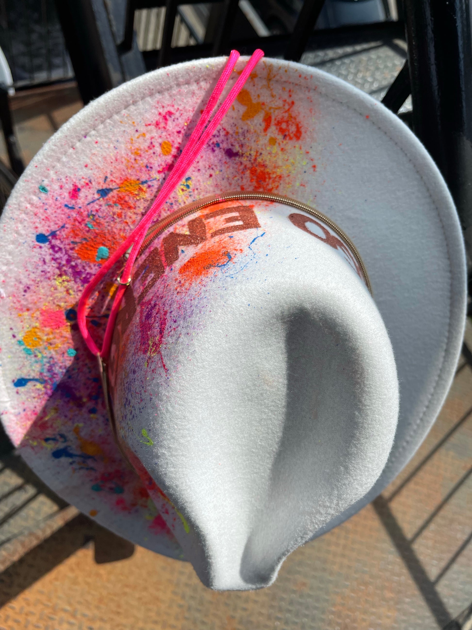 Rock your own custom fedora any day; for all seasons. Add custom hand-paint with you name, business, or even slogan. Production of this custom product takes up to 2 weeks. Fedoras is one size fits most measuring 57-59 centimeter circumference with adjustable string in the inside. Brim width is 3 inches. Made of Quality Felt material. No Returns or exchanges. Hand wash only with damp towel.