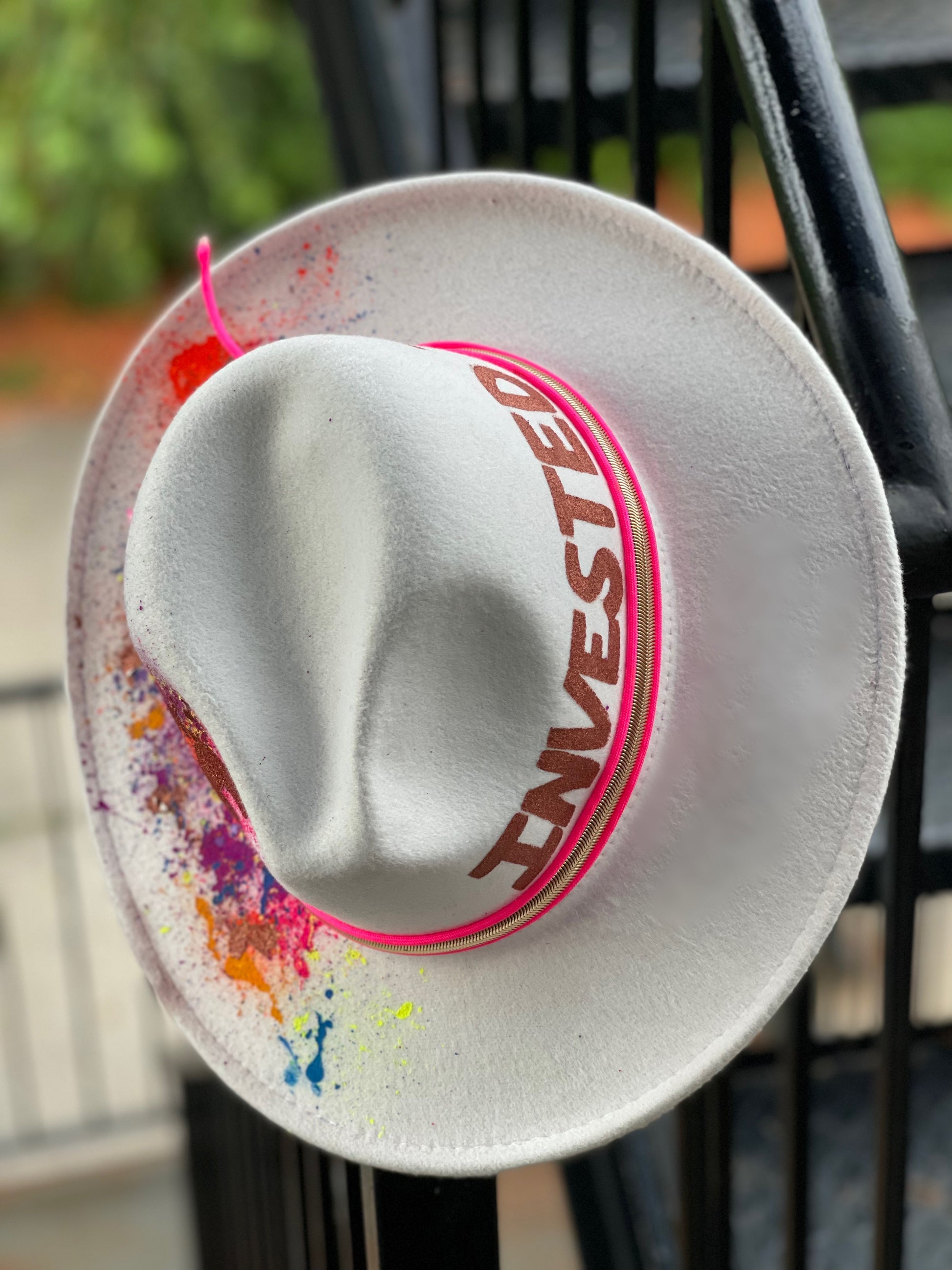 Dope women get it custom. Shop this already hand-painted INVESTED IN MYSELF White Red Bottom fedora.